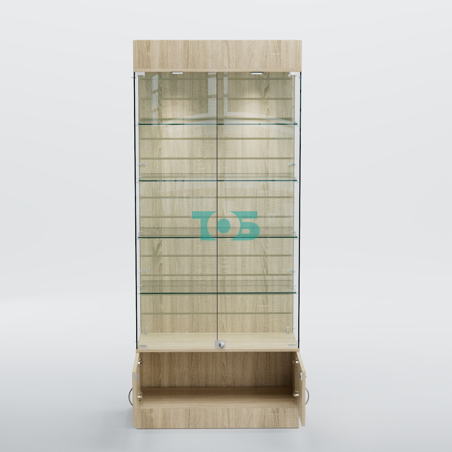 - в прозрачной части - распашные стеклянные дверки с замком;