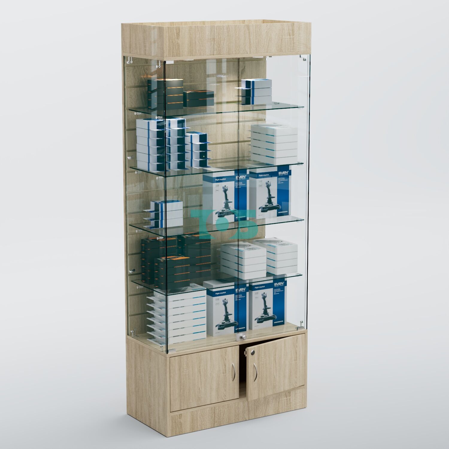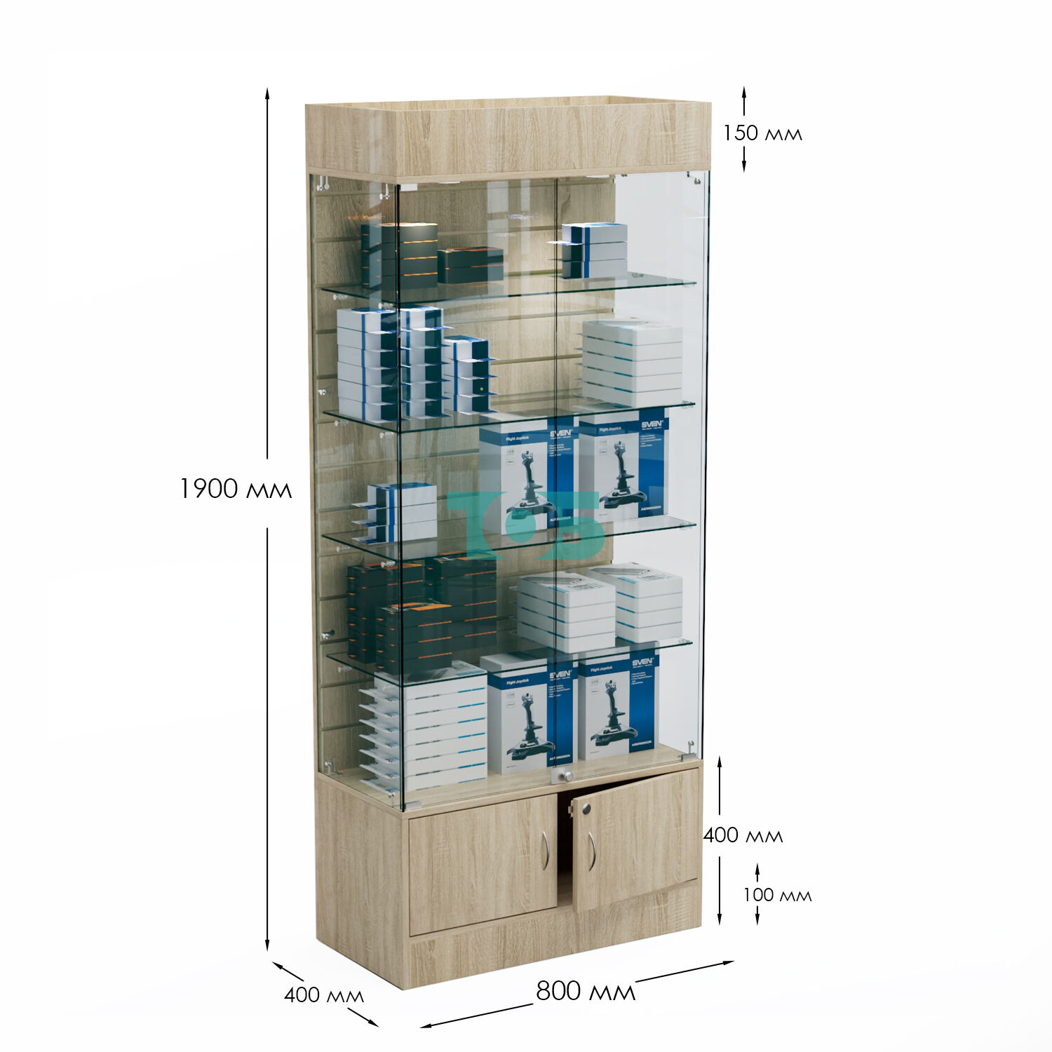 Витрина со стеклянными полками и подсветкой для салона связи №2 предлагает широкие возможности для демонстрации товара - телефонов, планшетов, mp3-плееров и различных аксессуаров. Задняя стенка служит для вывески товара на крючках разной длины, а полки - для выкладки товара ближе к покупателю.