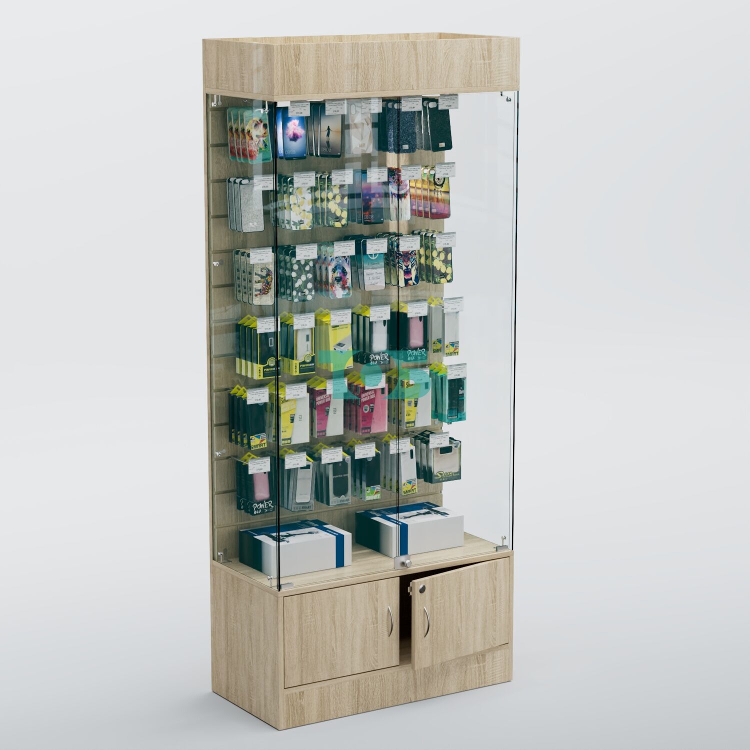Витрина с эконом-панелью для салона связи №2 предлагает широкий обзор товара и функциональность.