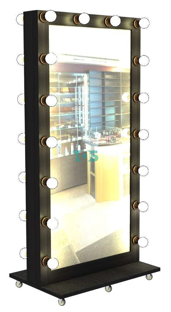 - зеркало имеет напольную конструкцию, полностью автономную, с металлическими колесами для свободного позиционирования в любой точке торгового зала;